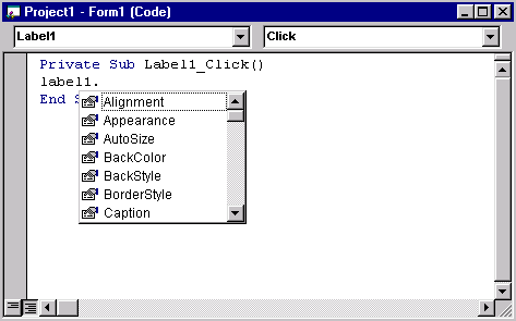 При вводе команд в окне редактора кода, после того как введено имя объекта и поставлена точка, открывается список свойств и методов объекта (рис. 3.17), который можно использовать для ввода информации. Выберите из списка свойство caption, дважды щелкнув кнопкой мыши, и оно будет вставлено в процедуру.