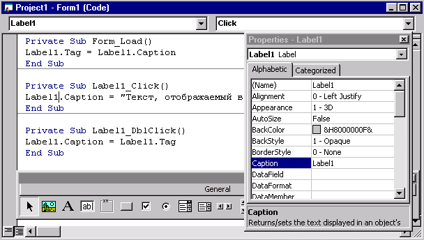 Labell.Caption = "Текст, отображаемый в форме при нажатии кнопки мыши"