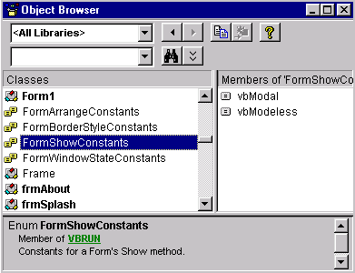 Окно браузера и окно проводника при работе над проектом дополняют друг друга. В проводнике более наглядна иерархия проекта и из него запускается визуальное проектирование объектов, а в браузере подробно представлен состав элементов проекта, библиотек, классов. В окне Object Browser удобно работать с объектами более низкого уровня, чем формы, диалоговые окна, файлы проекта. Из окна браузера запускается редактор кода объектов, запуск визуального проектирования здесь недоступен.