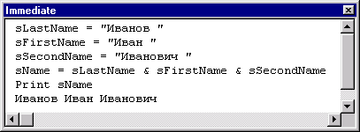 Например, объединение строк удобно использовать при формировании полного адреса, если известен индекс, город и улица. В следующем примере и на рис. 5.7 показан результат объединения фамилии, имени и отчества в окне Immediate: