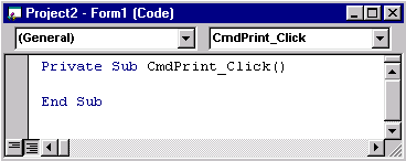 Наименование процедуры обработки события для элемента управления формы содержит имя элемента управления, заданное в свойстве Name, затем следует символ подчеркивания (_) и имя события. Например, имя процедуры, выполняемой при щелчке мыши на кнопке управления, имеющей наименование cmdPrint будет Form_Click.