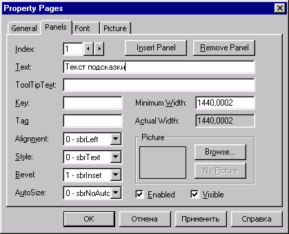 Строка состояния состоит из набора панелей, каждая из которых является объектом и имеет следующие основные свойства: