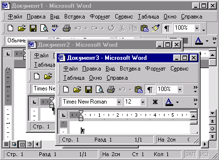 Главная особенность MDI заключается в том, что для этого типа интерфейса можно многократно открывать форму одного вида документа для нескольких разных по содержанию документов. Примером интерфейса типа MDI может служить программа Microsoft Word (рис. 7.2).