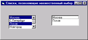 Для обработки множественного выбора нельзя использовать свойство Listindex, применяемое при работе с обычными списками. Выбор нескольких элементов списка фиксируется в свойстве Selected, являющимся массивом, размерность которого равна количеству элементов в списке (определяется свойством ListCount). Выбранному элементу списка соответствует значение True соответствующего элемента свойства selected, а остальным — False.