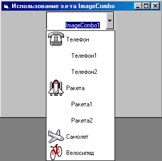 Элемент управления ImageCombo представляет собой графическое поле со списком и аналогичен рассмотренному нами ранее объекту ComboBox. Но в отличие от последнего, объект типа imagecombo позволяет добавлять в раскрывающийся список не только текст, но и графические объекты.