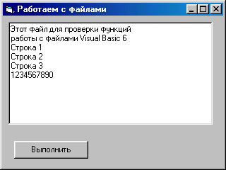 Работающее приложение показано на рис. 9.3. В данном случае при нажатии кнопки Выполнить открывается диалоговое окно поиска файла. Путь и имя файла, возвращаемое диалоговым окном, хранятся в переменной strFileName. Найденный файл (он должен быть текстовым) открывается при помощи оператора open для чтения данных. Функция input считывает сразу весь файл в переменную strFileContent, содержимое которой затем помещается в текстовое поле txtFile. После выполнения всех действий файл закрывается оператором close.