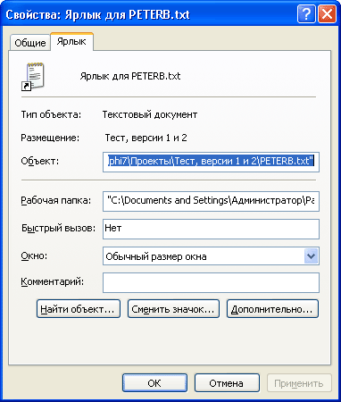 свойств значка, изображающего программу тестирования на рабочем столе или в