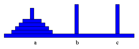 На стержень а нанизаны n дисков, расположенных по возрастанию диаметра. Необходимо переместить диски со стержня а на стержень с, используя стержень b и соблюдая следующие ограничения: можно перемещать только один диск одновременно, диск большего диаметра никогда не может находиться на диске меньшего диаметра.