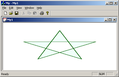 Мы изменили stdafx.h, и компилятор заново проходит по всем зависящим (dependent) от него файлам. После построения и запуска изображение звезды должно появиться в клиентской области дочернего окна-рамки, то есть в окне, управляемом классом CMyView.