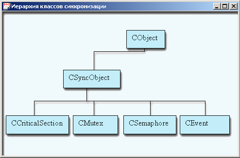 MFC предоставляет несколько классов, реализующих механизмы синхронизации. Прежде всего отметим, что хорошо спроектированный {thread-safe) класс не должен требовать особых затрат для синхронизации работы с ним. Все делается внутри класса его методами. Обычно при создании надежного класса в него изначально внедряют какой-либо синхронизирующий объект. Например, критическую секцию, событие, семафор, мъютекс или ожидаемый таймер. Иерархию классов MFC для поддержки синхронизирующих объектов можно увидеть в MSDN: