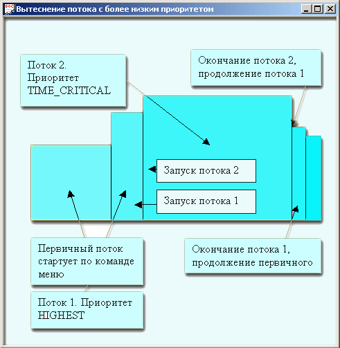 потока до величины приоритета первого. Это приводит к тому, что поток 3 вытесняется