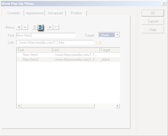 над списком пунктов, и задайте в полях ввода Text, Link и раскрывающемся