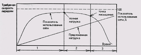 Рис. 7.2. Зависимость показателя использования сети от времени при линейном увеличении предложенной нагрузки (1 - наилучшая область работы, 2 - приемлемая, 3 - плохая) Некоторые авторы предлагают использовать для широко распространенного понятия «перегрузка» (overload) сетей на основе метода доступа CSMA/CD следующее определение: сеть перегружена, если она не может работать при полной нагрузке в течении не менее 80% своего времени (предполагается, что при этом в течении не менее 20% времени показатель использования сети недопустимо мал из-за коллизий). После точки насыщения наступает крах Ethernet (Ethernet collapse), когда возрастающая предложенная нагрузка заметно превышает возможности сети. Стоит заметить, что реально маловероятно, чтобы предложенная нагрузка постоянно увеличивалась во времени и надолго превышала пропускную способность сети типа Fast Ethernet. Более того, любой детерминированный метод доступа не может обеспечить реализацию сколь угодно большой предложенной нагрузки, существующей продолжительное время. Если данный вариант детерминированного метода доступа не предусматривает, как и метод CSMA/CD, систему приоритетов, то никакой из абонентов не может захватить сеть более чем на время передачи одного пакета, однако передача данных отдельными пакетами с долгими паузами между ними ведет к снижению скорости передачи для каждого абонента. Однако преимущество детерминированных методов состоит в возможности простой организации системы приоритетов, что полезно из-за существования определенной иерархии в любом крупном коллективе. |